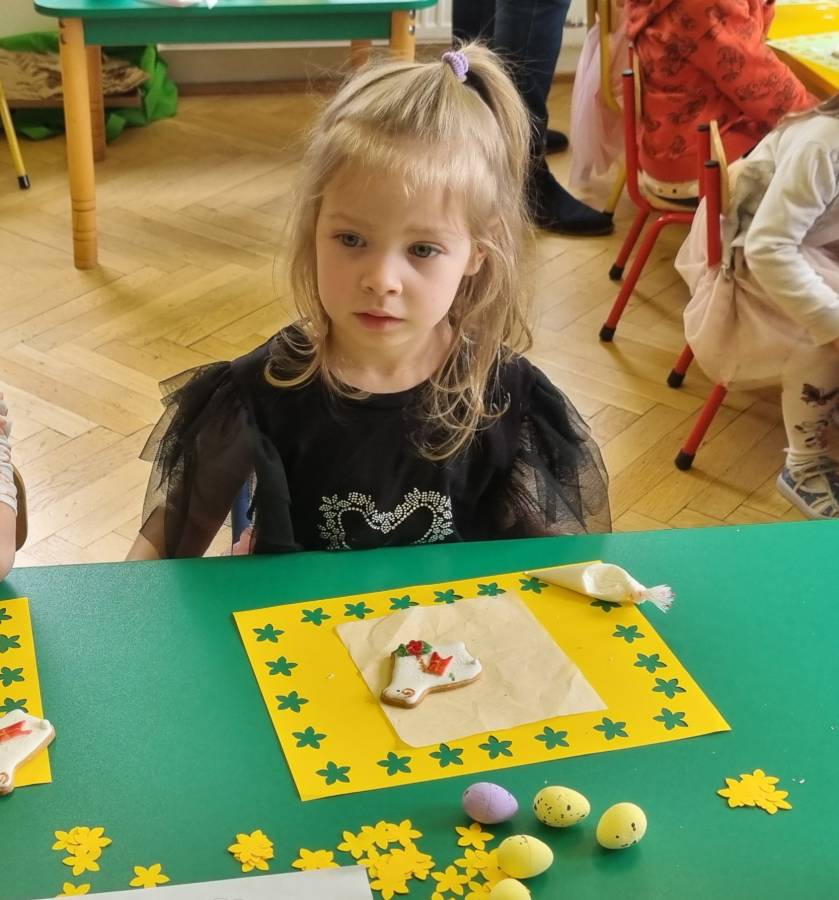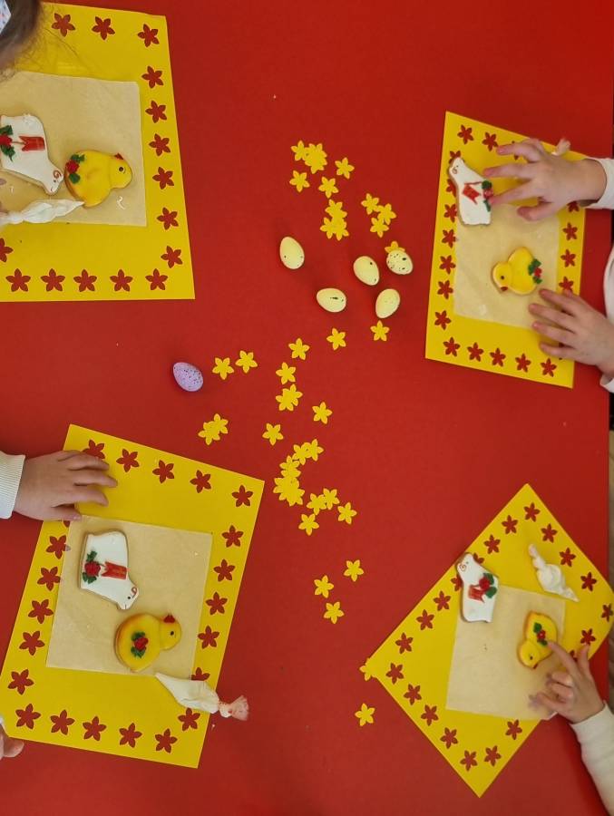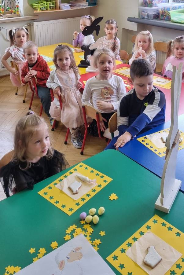 Na początku spotkania dzieci utrwaliły sobie tradycje i zwyczaje Wielkanonce, a następnie samodzielnie udekorowały baranki i kurczaczki.