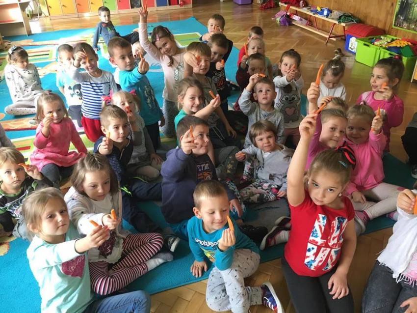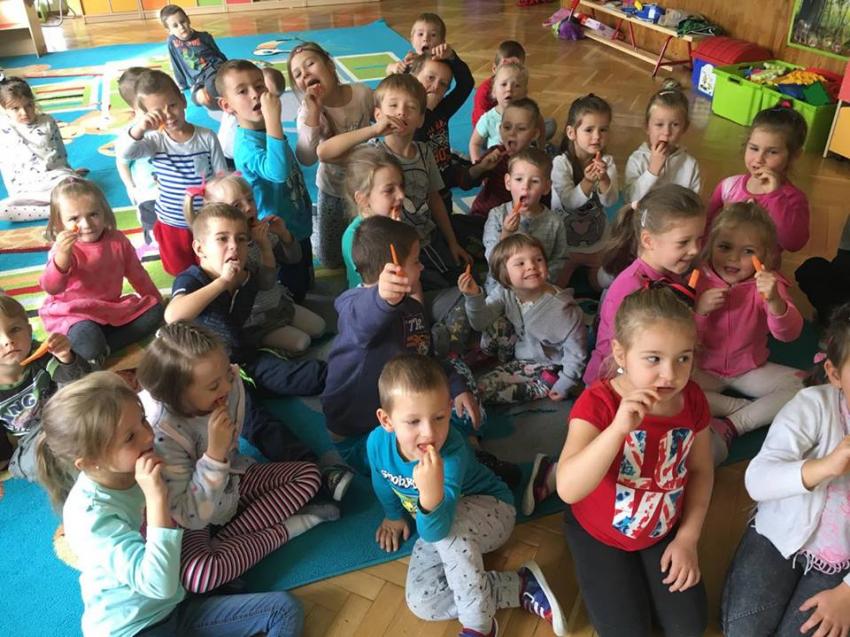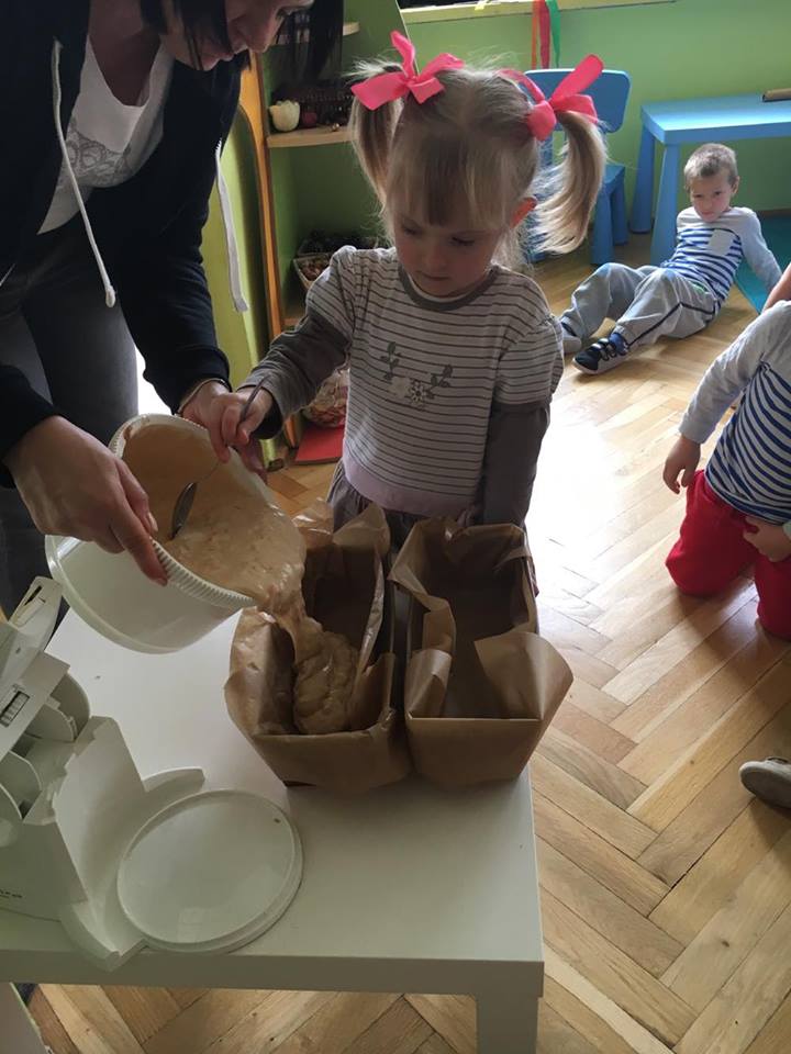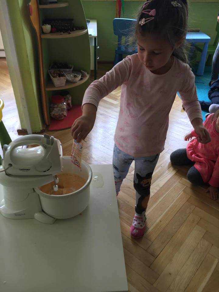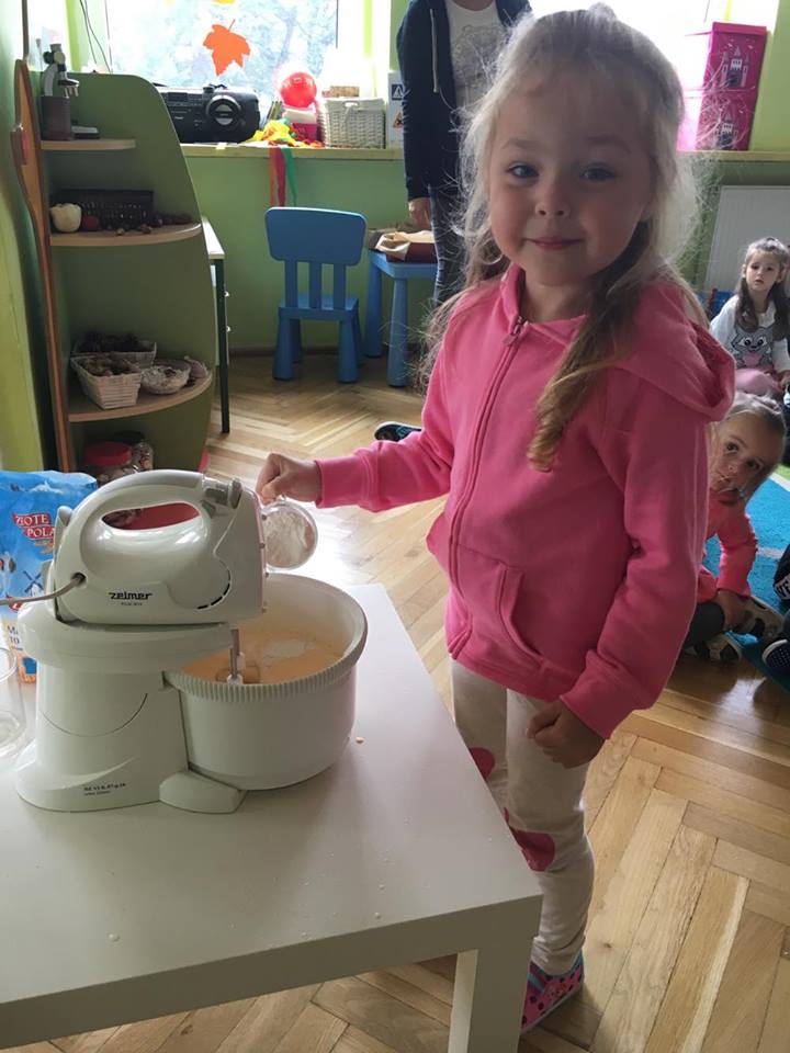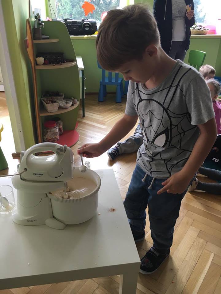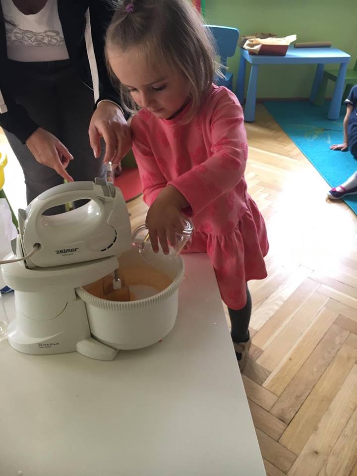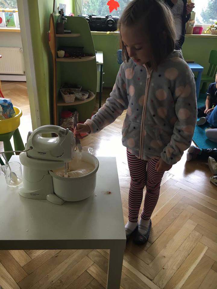 29.09.2017r. dzieci z obu grup zmierzyły się z zadaniem, jakim było upieczenie ciasta marchewkowego. Od rana trwały duże przygotowania, a mali kucharze byli bardzo podekscytowani. Na początku naszych praktycznych zajęć zapoznaliśmy się z przepisem i potrzebnymi składnikami. Dzieci z dużą ochotą pomagały w jego przygotowaniu- odmierzały składniki i ostrożnie je mieszały, każdy chciał mieć swój udział w przygotowaniu pyszności. Gotowe ciasto było bardzo smakowite i szybko zostało zjedzone. :)