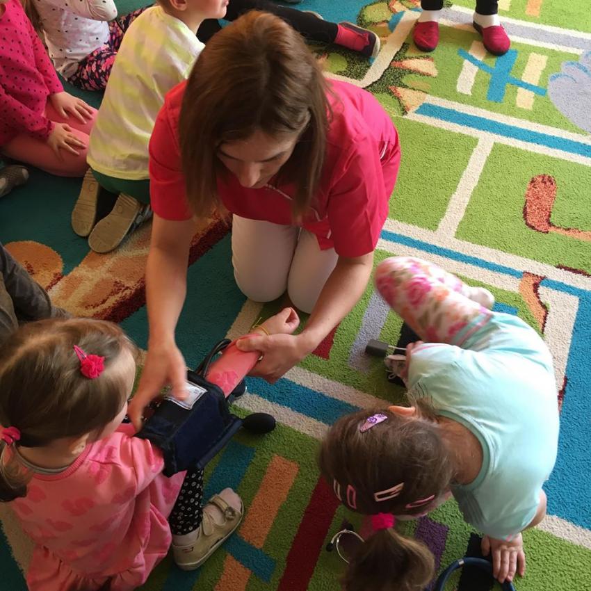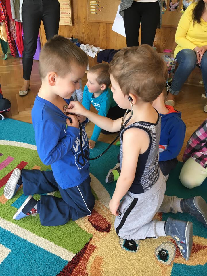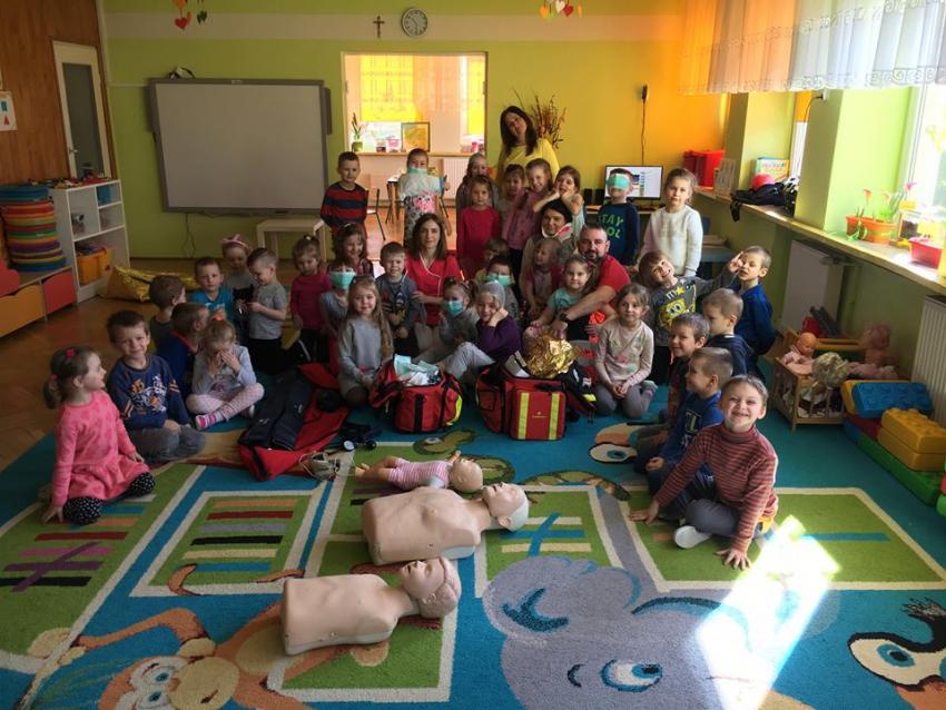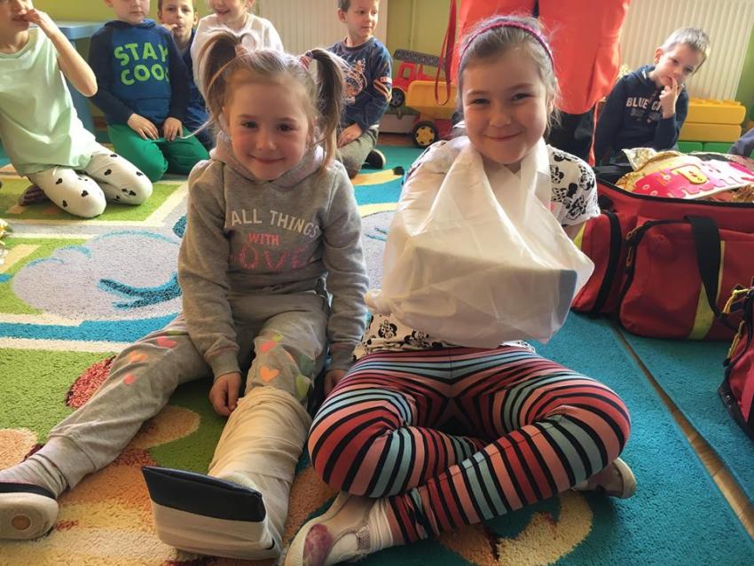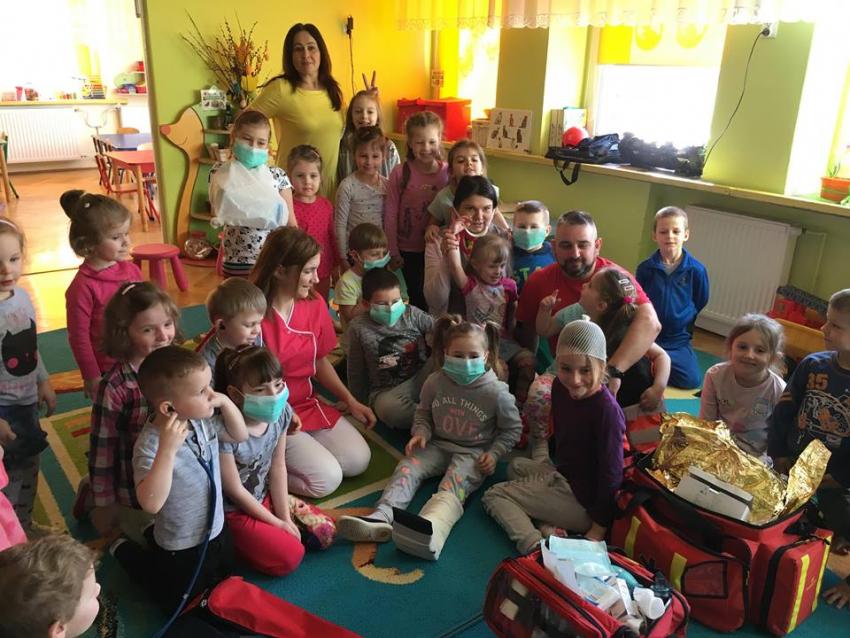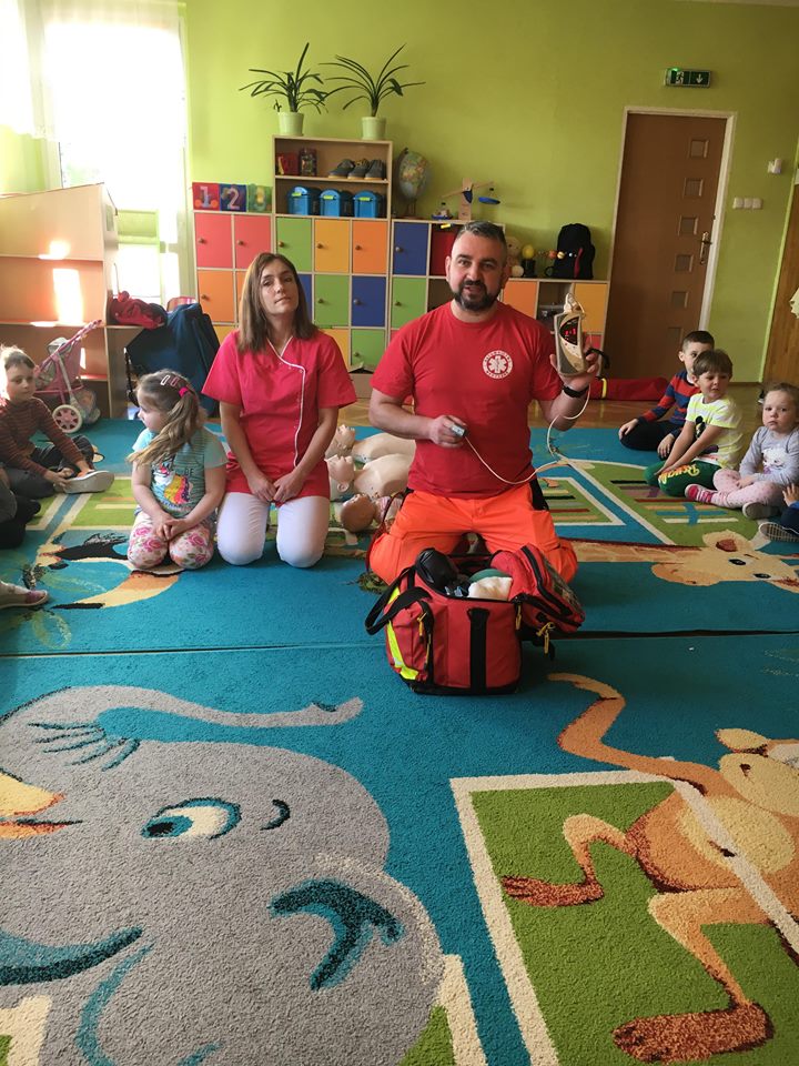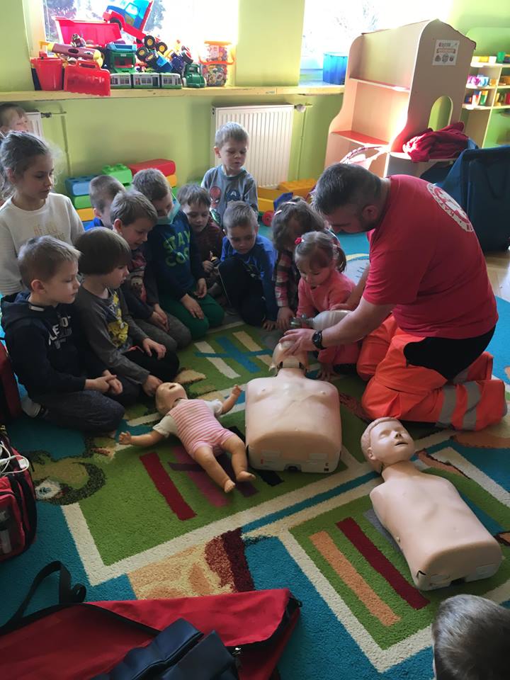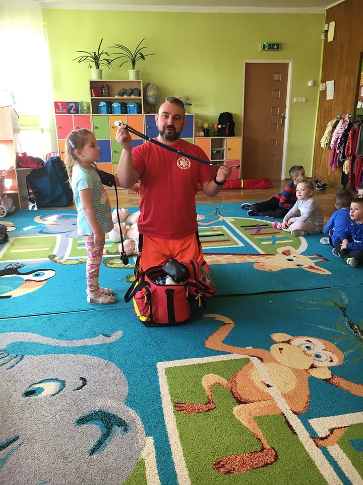 W piątek 06.04.2018r. gościliśmy w naszym przedszkolu rodziców Sary, tato jest ratownikiem medycznym a mama pielęgnierką. Dzieci miały okazję wysłuchać informacji na temat udzielania pierwszej pomocy. Przedszkolaki uczyły sie w jaki sposób można komuś pomóc zanim przyjedzie pogotowie ratunkowe. Jak należy sprawdzać przytomność osoby poszkodowanej oraz w jaki sposób wzywać pomoc. Na zakończenie spotkania przedszkolaki zadawały pytania dla Pani pielęgniarki dotyczące m.in. zachowania się podczas skaleczeń. Dzieki takiej lekcji dzieci nauczyły się wielu ważnych rzeczy, które w przyszłości być może przyczynią się do uratowania komuś życia. Naszym Gościom- Państwu Tomera bardzo dziękujemy za przybycie do naszego przedszkola!