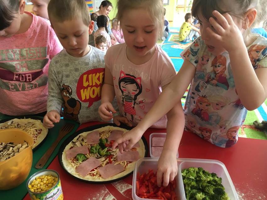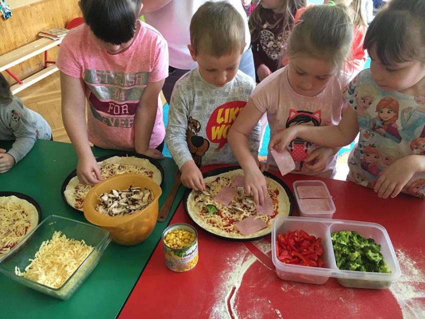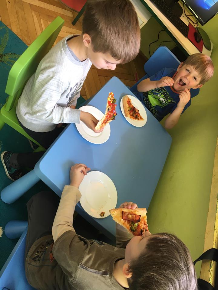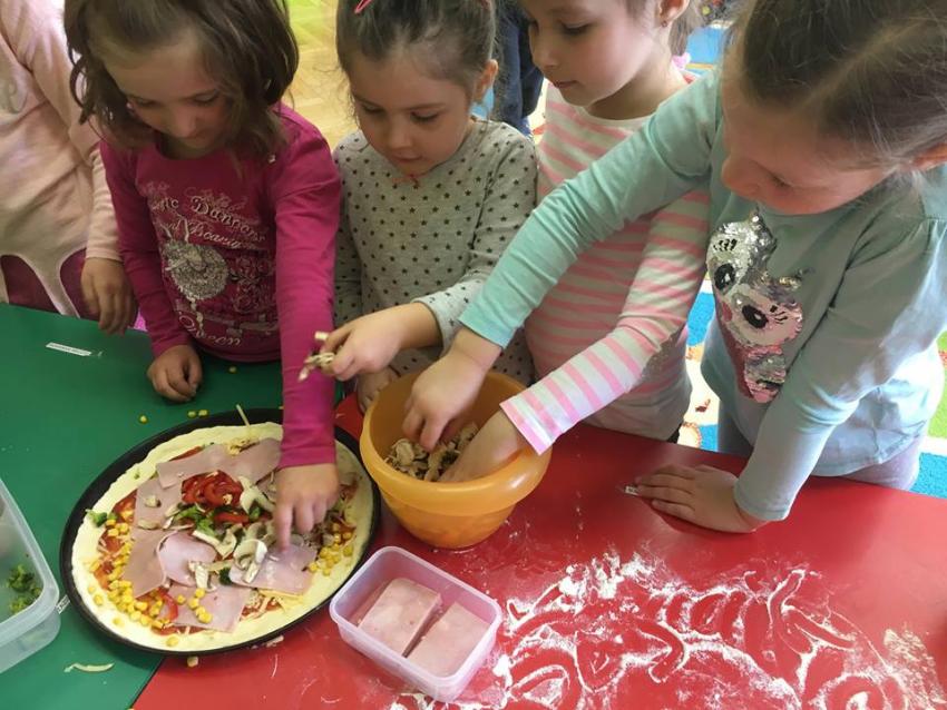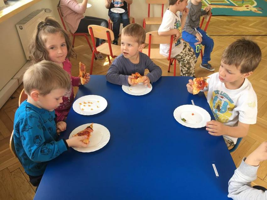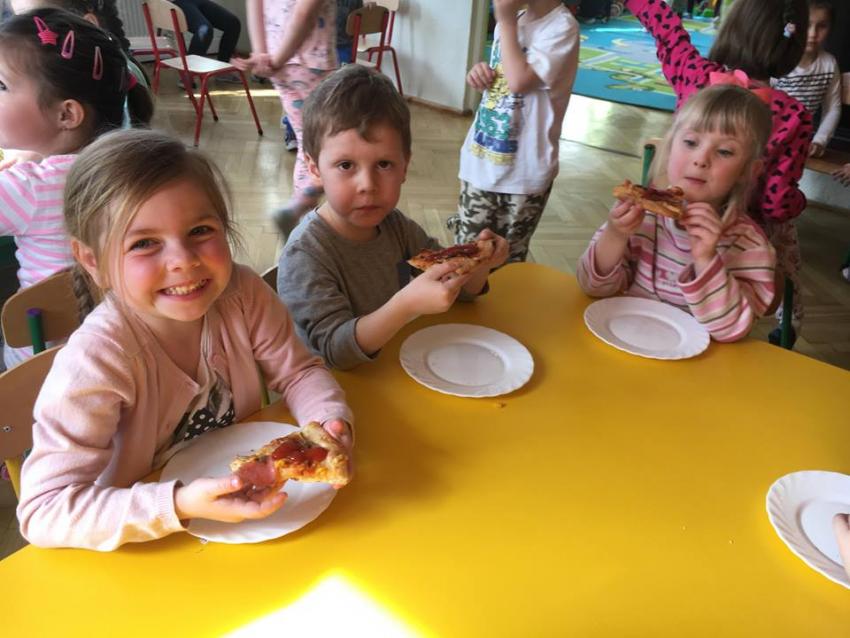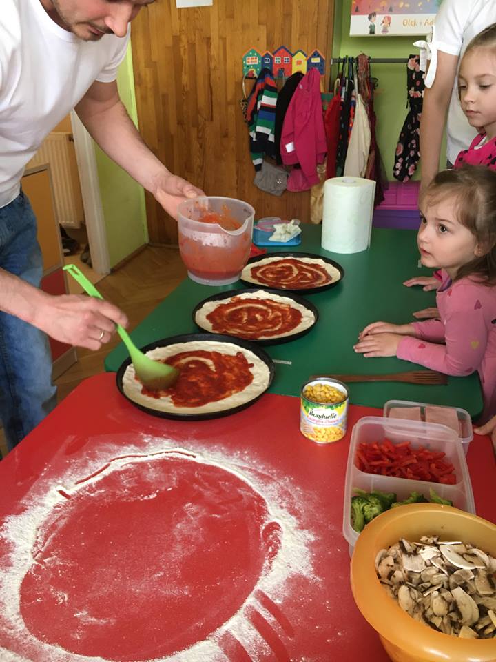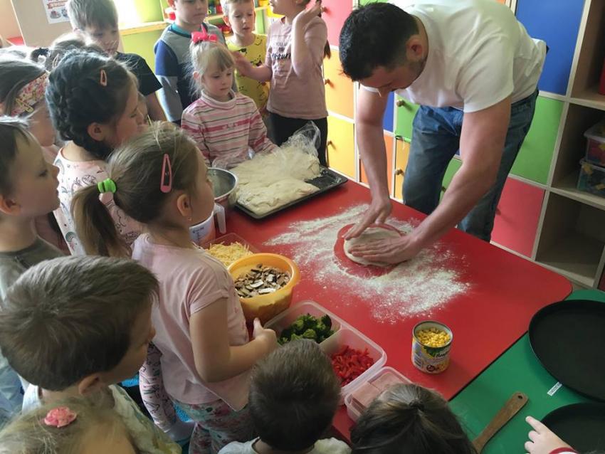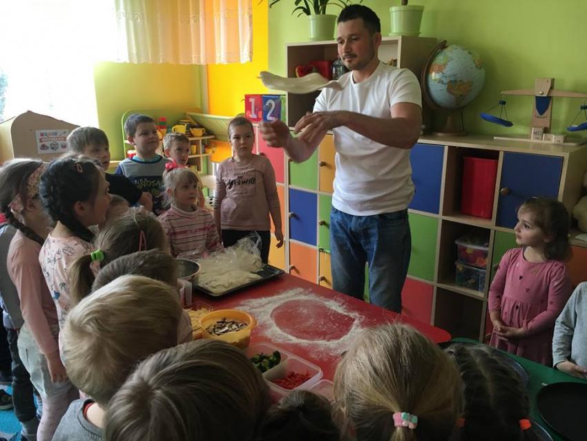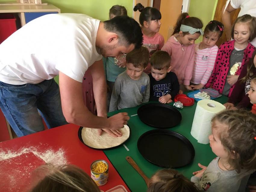 W czartek 12.04.2018r. gościliśmy w naszym przedszkolu tatę Nadii, który pokazał nam jak robi się prawdziwą pizze. Jak prawdziwy pizzerman podrzucał ciastem co sprawiało wiele frajdy dzieciom :) Każdy przedszkolak mógł przygotować pizzę. Pomysłów było wiele, a przy tym wyśmienita zabawa, o której słyszeli i którą bez wątpienia poczuli wszyscy w naszym przedszkolu. Dzieci z wielkim apetytem próbowały własnoręcznie przygotowaną pizzę i zgodnie przyznały, że była doskonała. Dziękujemy bardzo za przybycie do naszego przedszkola tacie Nadii- Panu Łukaszowi Ilnickiemu! :)