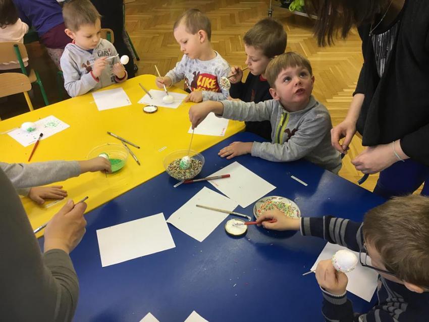 Właśnie z tej okazji zaprosiliśmy Rodziców dzieci na zajęcia otwarte, na których poznawaliśmy tradycje i zwyczaje świąteczne oraz przygotowywaliśmy ozdoby świąteczne. Na zajęciach przedszkolaki, przygotowanych różnorodnych materiałów plastycznych przy pomocy Rodziców, wykonały piękne wielkanocne dekoracje. Dzieci wykonały świąteczne babeczki, ozdobiły styropianowe jajeczka, stroiki a także wspólnie przystroiły duże papierowe jajka.
