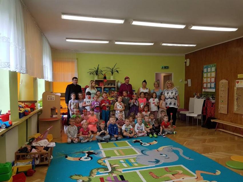 Dnia 20 czerwca nasze przedszkole swoją obecnością zaszczycił biskup pomocniczy Diecezji Świdnickiej Adam Bałabuch wraz z księdzem Adamem Łyczkowskim. Przedszkolaki po przywitaniu biskupa i towarzyszących mu osób zaspiewały piosenki, porozmawiały m.in. nt. bycia grzecznym i dobrym, a także wszyscy razem odmówiliśmy modlitwę. Na pożegnanie biskup otrzymał od przedszkolaków serduszka, a także pisemne podziękowanie za wizytę, dzieciaczki natomiast otrzymały na pamiatkę obrazek święty.