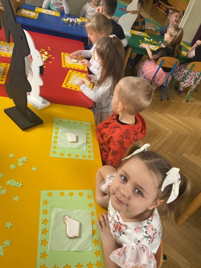 Na początku spotkania dzieci utrwaliły sobie tradycje i zwyczaje Wielkanonce, a następnie samodzielnie udekorowały baranki i kurczaczki.