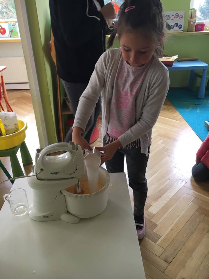 29.09.2017r. dzieci z obu grup zmierzyły się z zadaniem, jakim było upieczenie ciasta marchewkowego. Od rana trwały duże przygotowania, a mali kucharze byli bardzo podekscytowani. Na początku naszych praktycznych zajęć zapoznaliśmy się z przepisem i potrzebnymi składnikami. Dzieci z dużą ochotą pomagały w jego przygotowaniu- odmierzały składniki i ostrożnie je mieszały, każdy chciał mieć swój udział w przygotowaniu pyszności. Gotowe ciasto było bardzo smakowite i szybko zostało zjedzone. :)
